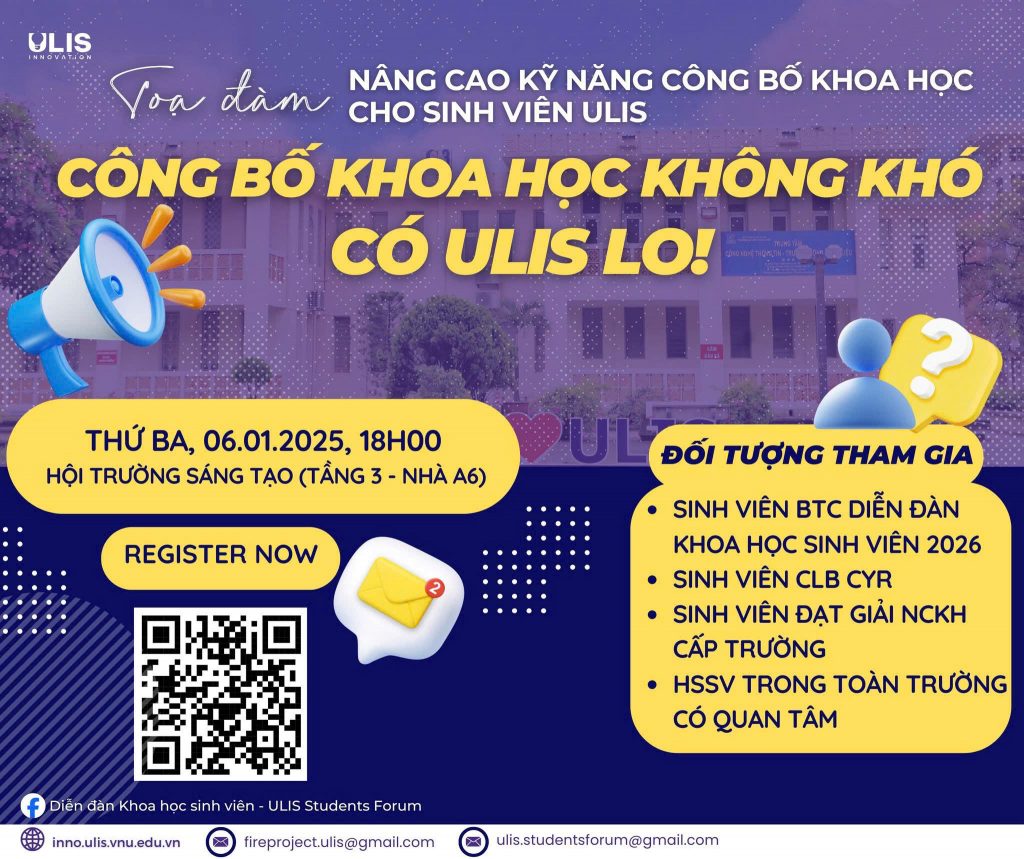 👉 Xuất phát từ nhu cầu đó, tọa đàm “Nâng cao Kỹ năng công bố khoa học cho sinh viên ULIS – Công bố khoa học không khó – Có ULIS lo!” được tổ chức trong khuôn khổ Diễn đàn Khoa học Sinh viên ULIS 2026, với mong muốn đồng hành và tháo gỡ những băn khoăn thực tế cho sinh viên trên hành trình công bố khoa học.