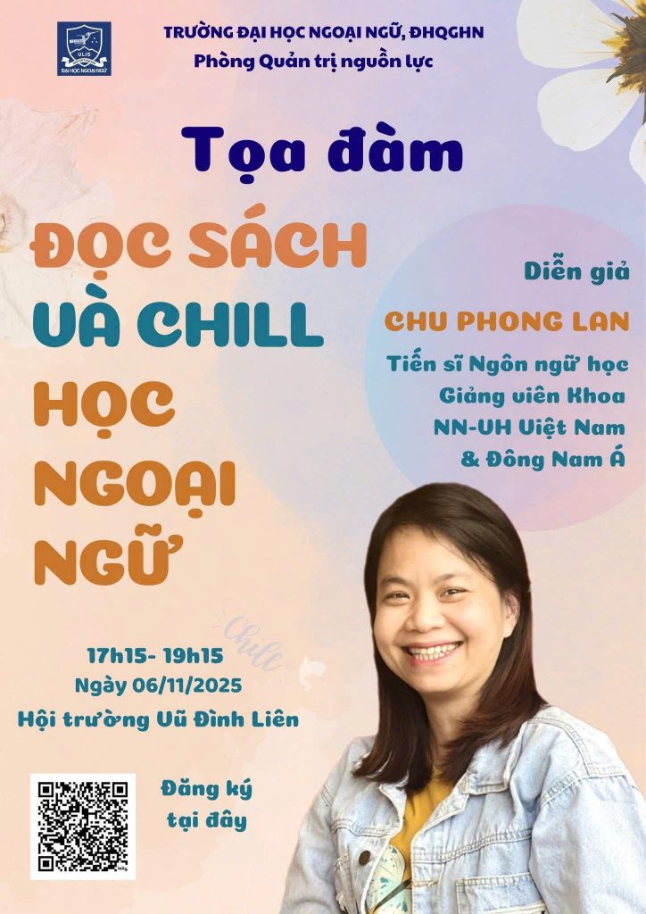 Hãy cùng đến với buổi tọa đàm “Đọc sách và chill học ngoại ngữ”, nơi bạn được lắng nghe những chia sẻ truyền cảm hứng về việc kết hợp đọc sách và học ngoại ngữ một cách hiệu quả, tự nhiên và thư giãn cùng diễn giả TS. Chu Phong Lan – Giảng viên Khoa Ngôn ngữ & Văn hóa Việt Nam và Đông Nam Á, Trường Đại học Ngoại ngữ – Đại học Quốc gia Hà Nội.