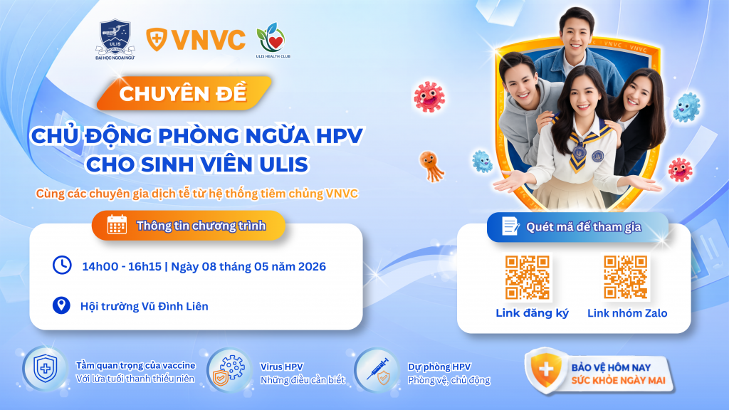 🎉 Nhằm nâng cao nhận thức về chăm sóc sức khỏe chủ động, Trường Đại học Ngoại ngữ – ĐHQGHN phối hợp cùng Hệ thống Trung tâm Tiêm chủng VNVC tổ chức buổi tọa đàm chuyên sâu về dự phòng HPV dành riêng cho sinh viên 18+.