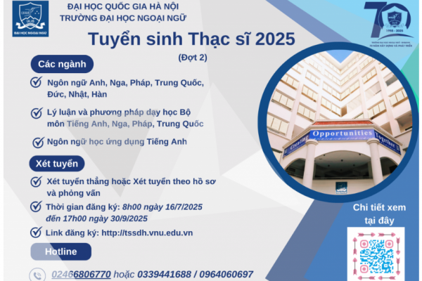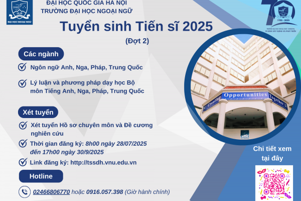 Trường Đại học Ngoại ngữ, ĐHQGHN tổ chức Hội đồng đánh giá Seminar tổng thể luận án tiến sĩ của nghiên cứu sinh Lê Thị Tố Hoa Ngành/chuyên ngành Lý luận và phương pháp dạy học Bộ môn tiếng Nga Khóa QH2021 đợt 1, cụ thể: Đề