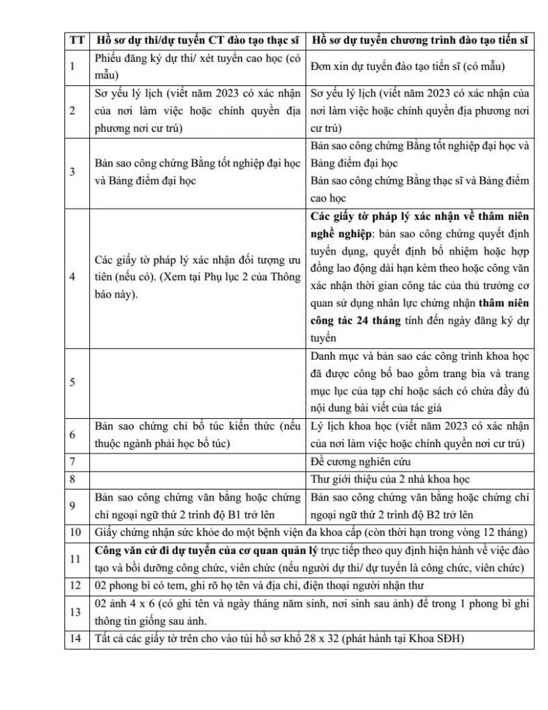 Câu hỏi 15: Hồ sơ dự thi/dự tuyển chương trình đào tạo Thạc sĩ/ Tiến sĩ gồm những gì?