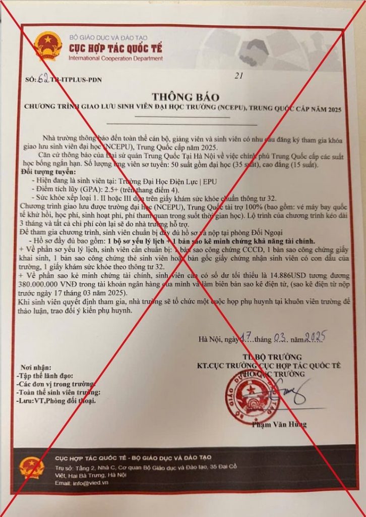 Cục Hợp tác quốc tế, Bộ Giáo dục và Đào tạo khuyến nghị cán bộ, người dân và các tổ chức cần thận trọng trước những văn bản làm giả chữ ký, con dấu, đưa thông tin giả về học bổng, tài trợ du học nhằm lừa đảo người học.
