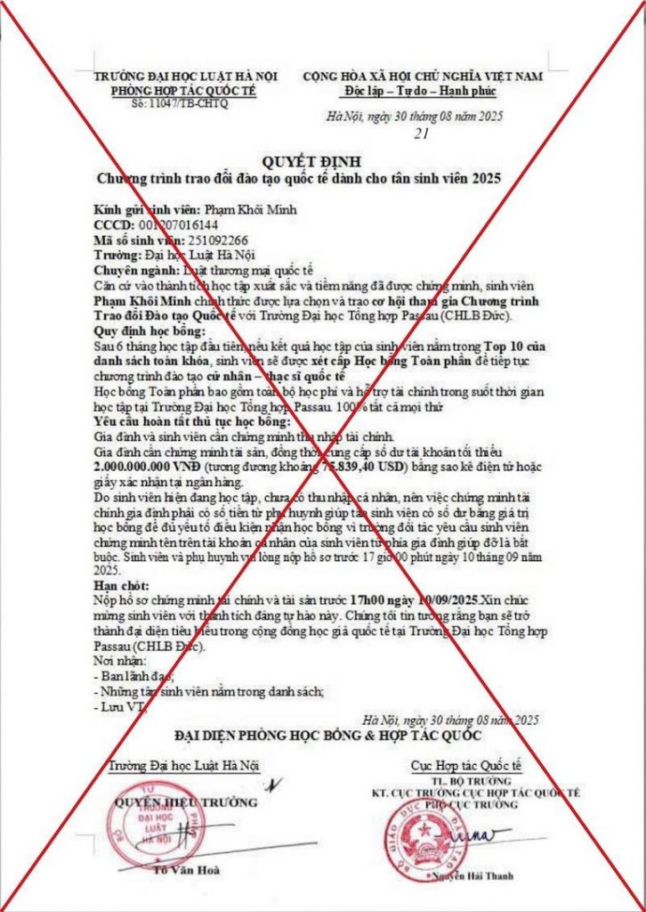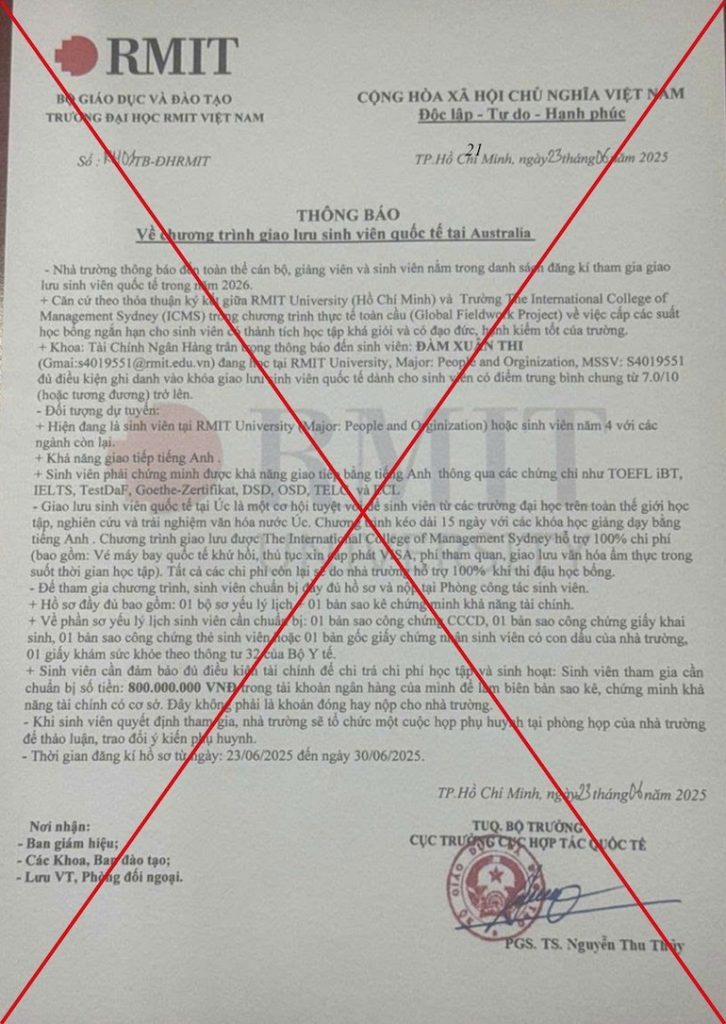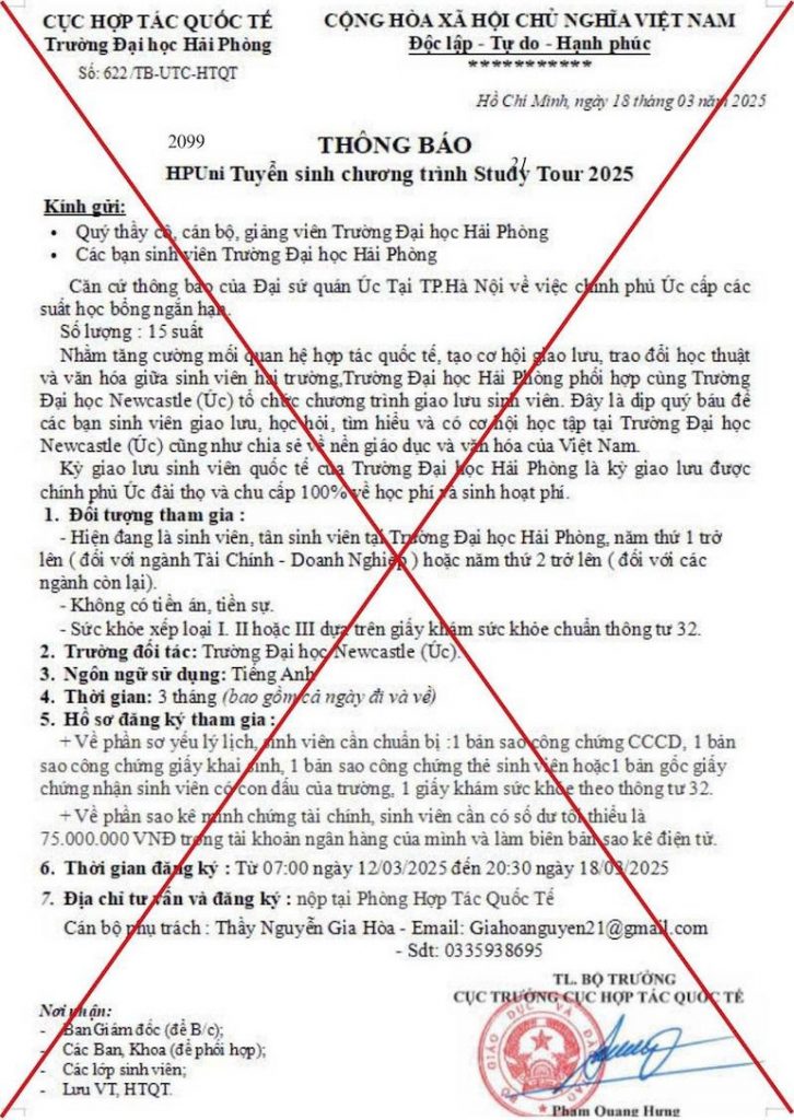 Cục Hợp tác quốc tế, Bộ Giáo dục và Đào tạo cho biết trong thời gian gần đây có thông tin về hiện tượng làm giả chữ ký, con dấu, thông tin giả về học bổng, tài trợ du học nhằm lừa đảo người học.