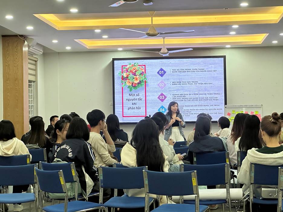 Trong suốt quá trình Tập huấn, các bạn đại sứ đã được tham gia hai hoạt động vẽ tranh “Tâm thế cần thiết của đại sứ để phản hồi tích cực”, chơi trò chơi “Đóng vai đại sứ và sinh viên, quan sát cách phản hồi”, “Đuổi hình bắt chữ đoán từ khóa”. Qua đó giới thiệu 6 kỹ thuật tăng cường kết nối tích cực: tương tác mắt, lắng nghe không phán xét, tư thế dấn thân, thể hiện sự quan tâm, kiên nhẫn, và đặt câu hỏi tích cực. Đây là những kỹ năng quan trọng để xây dựng lòng tin và sự thấu hiểu trong giao tiếp. Ngoài ra, kỹ năng phản hồi được đưa ra với các nguyên tắc như ghi nhận tiến bộ, đưa ra nhận xét cụ thể và hữu ích, tập trung vào hành vi có thể thay đổi, và tránh chỉ trích cá nhân. Những nguyên tắc này giúp các bạn sinh viên cảm thấy được tôn trọng, khích lệ và nhận ra tiềm năng thay đổi của bản thân, khuyến khích việc thực hành thông qua các bài tập nhóm, đóng vai và thảo luận, để có thể áp dụng lý thuyết vào thực tế một cách hiệu quả.