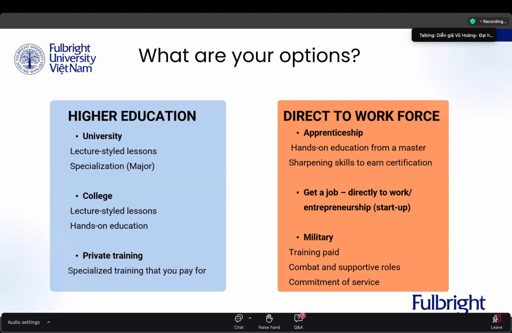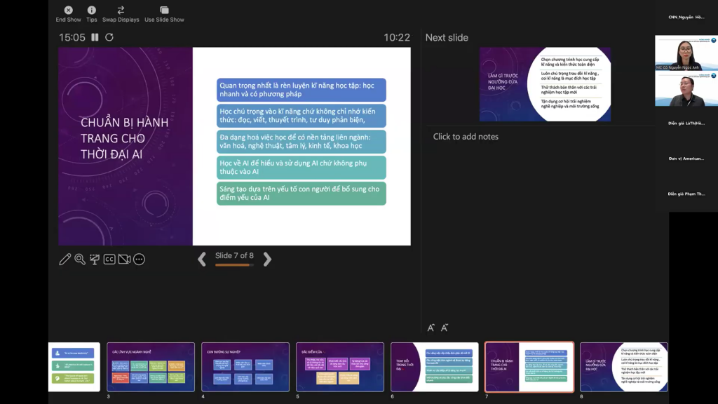 Trong bối cảnh AI phát triển mạnh mẽ, TS. Trần Vĩnh Linh – Giảng viên ĐH Fulbright chia sẻ về sự thay đổi của các ngành nghề trong kỷ nguyên trí tuệ nhân tạo. Bên cạnh đó, ông Vũ Hoàng – – Chuyên viên cấp cao Tư vấn Hướng nghiệp & Tuyển sinh ĐH Fulbright cũng giới thiệu lựa chọn “du học tại chỗ” thông qua các chương trình giáo dục đại học chuẩn quốc tế ngay tại Việt Nam – một hướng đi mới mẻ và thiết thực.