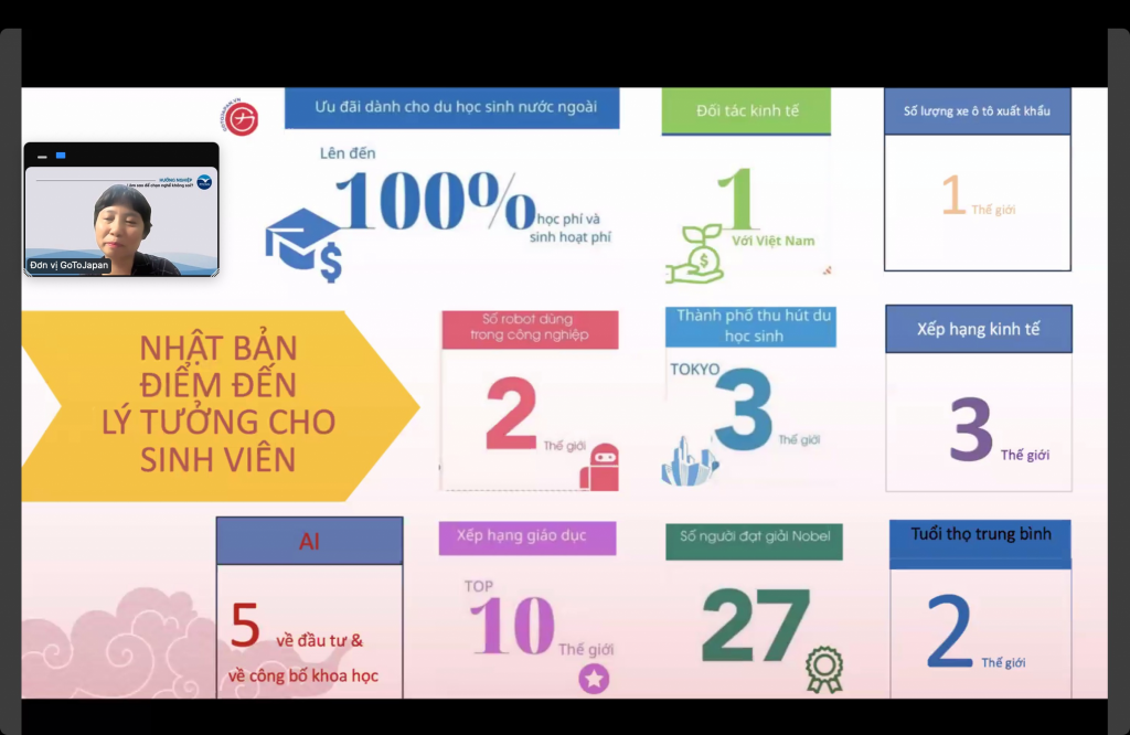Cuối cùng, bà Nguyễn Thị Minh Hải – Giám đốc Trung tâm tư vấn du học và đào tạo tiếng Nhật GotoJapan với tham luận “Chọn nghề, chọn con đường – Nhật Bản có là bàn đạp giúp bạn vươn tới tầm cao sự nghiệp?” đã mang đến nhiều góc nhìn thú vị về cơ hội học tập và làm việc tại đất nước mặt trời mọc, góp phần giải đáp thắc mắc của những học sinh quan tâm đến du học Nhật Bản.