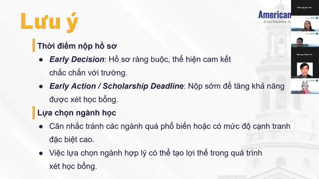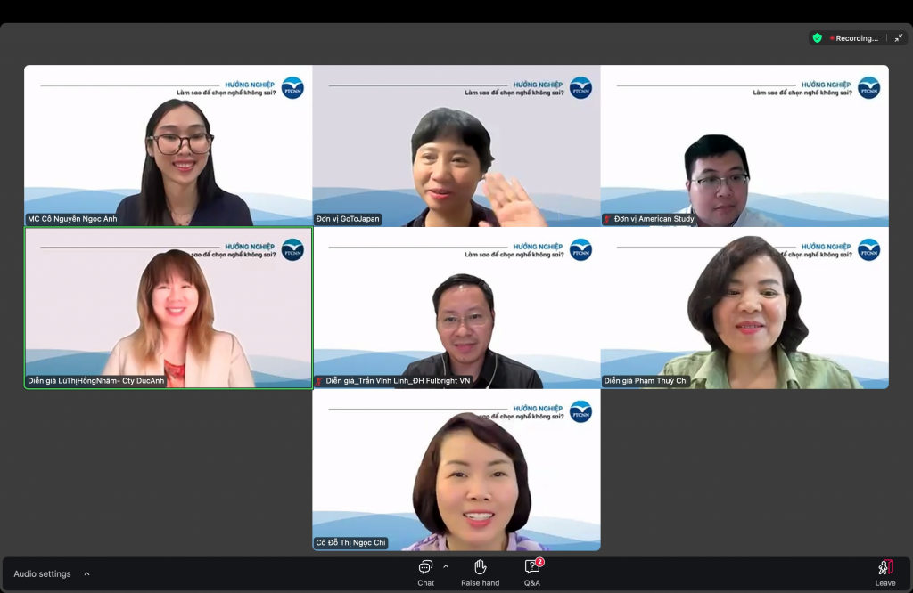 Đến dự chương trình, về phía Ban Giám hiệu nhà trường có thầy Nguyễn Phú Chiến – Hiệu trưởng, cô Đỗ Ngọc Chi – Phó Hiệu trưởng, và cô Mai Thị Loan – Phó Hiệu trưởng. Các diễn giả khách mời đồng thời là đại diện các đơn vị hợp tác gồm: bà Phạm Thùy Chi – Chuyên gia tư vấn hướng nghiệp VTV7; TS. Nguyễn Tiến Vĩnh – Đại diện Công ty American Study; bà Lù Thị Hồng Nhâm – Giám đốc Công ty Đức Anh EduConnect; TS. Trần Vĩnh Linh – Giảng viên Đại học Fulbright Việt Nam; ông Vũ Hoàng – Chuyên viên cấp cao Tư vấn Hướng nghiệp & Tuyển sinh Đại học Fulbright; thạc sĩ Nguyễn Thị Minh Hải – Giám đốc Trung tâm tư vấn du học và đào tạo tiếng Nhật GotoJapan. Năm nay, chương trình được tổ chức trực tuyến trên nền tảng Zoom Webinar với sự tham gia của hơn 2.000 học sinh và phụ huynh Nhà trường.
