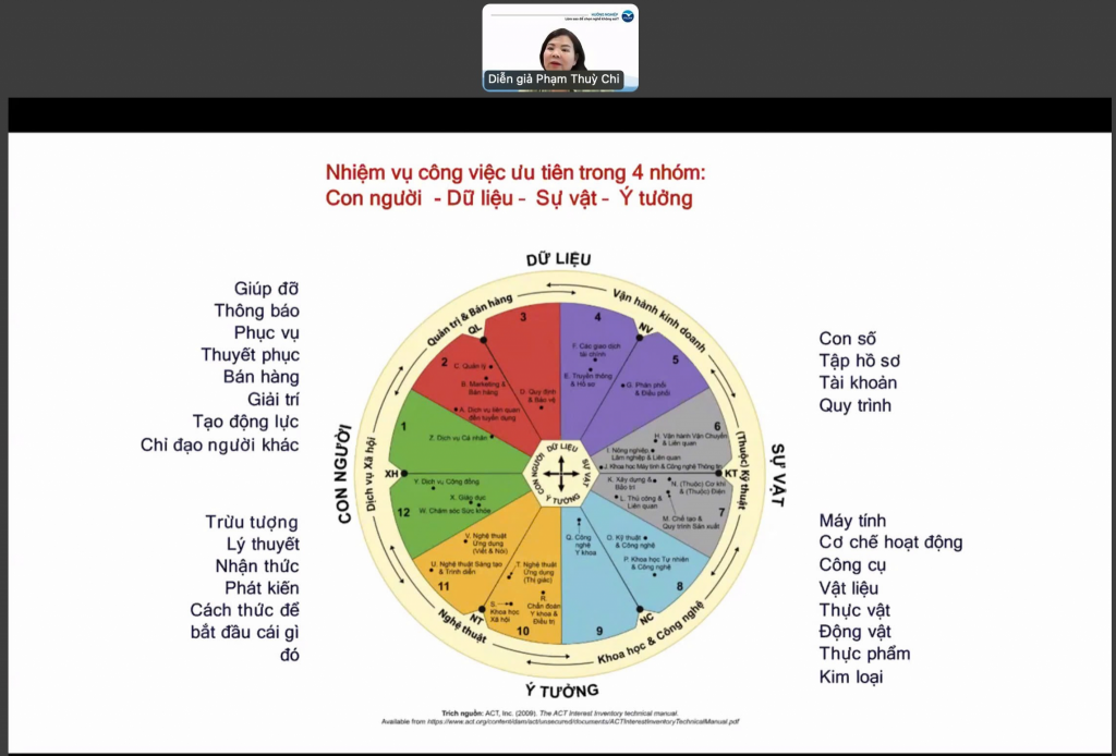 Bà Phạm Thùy Chi – chuyên gia tư vấn hướng nghiệp VTV7 với tham luận “Tổng quan về định hướng chọn ngành nghề trong bối cảnh mới vươn mình của đất nước và quốc tế” đã chỉ ra những thay đổi đáng chú ý trong giáo dục và thị trường lao động hiện nay, đồng thời đưa ra các bước cụ thể giúp học sinh cân nhắc trước khi lựa chọn nghề nghiệp, cũng như gợi ý cách xây dựng kế hoạch học tập hiệu quả trong ba năm THPT.