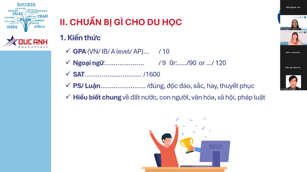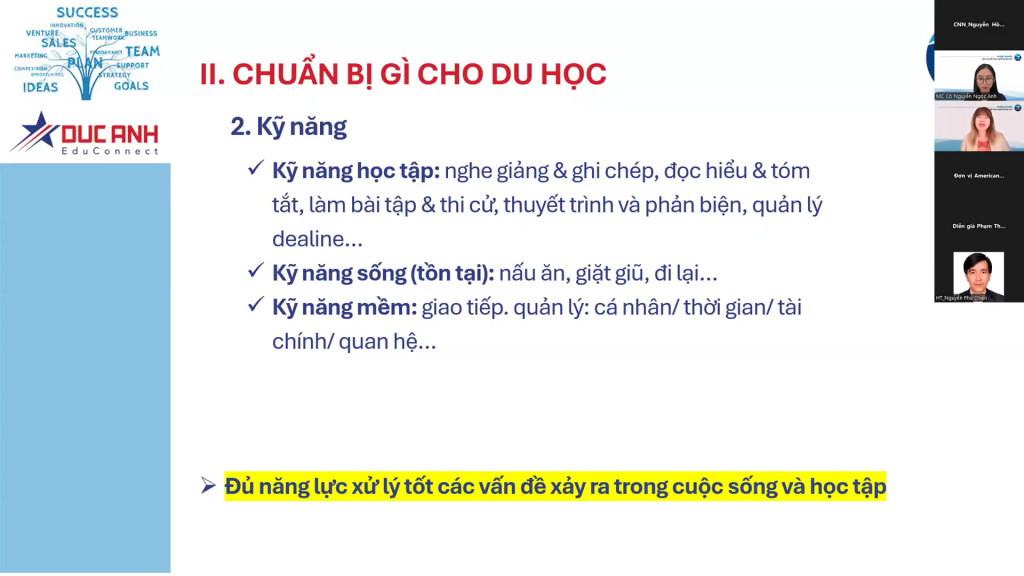 Bà Lù Thị Hồng Nhâm – đại diện Công ty Đức Anh EduConnect mang đến bài tham luận “Lộ trình lên kế hoạch và chuẩn bị hồ sơ du học tại các nước nói tiếng Anh”. Bà đã giúp học sinh CNN hiểu rõ cách xây dựng lộ trình hiệu quả, chuẩn bị kỹ năng mềm, GPA, bài luận và hoạt động ngoại khóa để tăng cơ hội thành công trên hành trình du học.