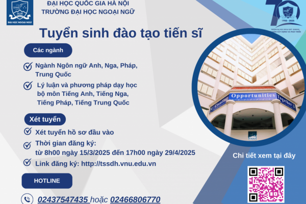 Thông báo Lịch họp Hội đồng đánh giá luận án tiến sĩ của nghiên cứu sinh Nguyễn Duy Dũng, Ngành/Chuyên ngành Lý luận và phương pháp dạy học Bộ môn tiếng Nga, thuộc khóa QH2019 đợt 2