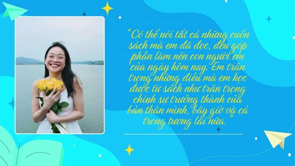 “Có thể nói tất cả những cuốn sách mà em đã đọc, đều góp phần làm nên con người em của ngày hôm nay. Em trân trọng những điều mà em học được từ sách như trân trọng chính sự trưởng thành của bản thân mình, bây giờ và cả trong tương lai nữa”, Hương nhấn mạnh.