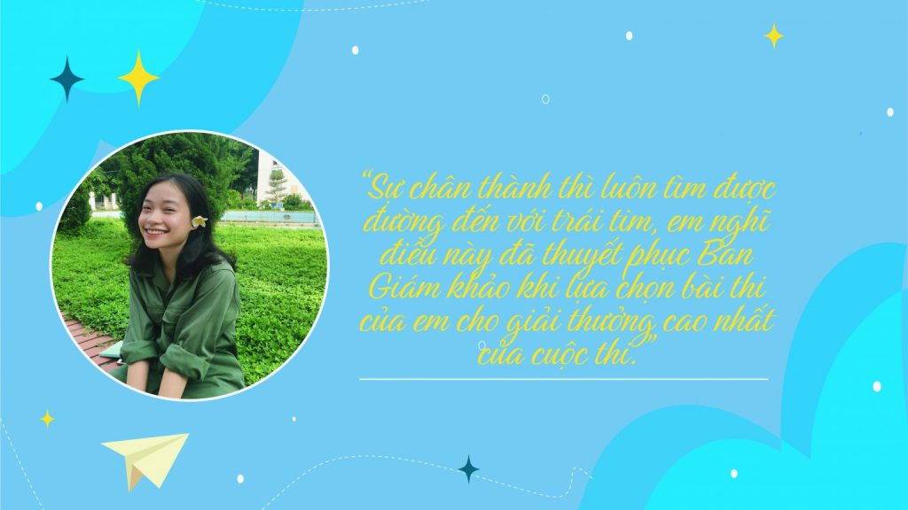 “Sự chân thành thì luôn tìm được đường đến với trái tim, em nghĩ điều này đã thuyết phục Ban Giám khảo khi lựa chọn bài thi của em cho giải thưởng cao nhất của cuộc thi”, cô nữ sinh đến từ Sơn Tây, Hà Nội nói.
