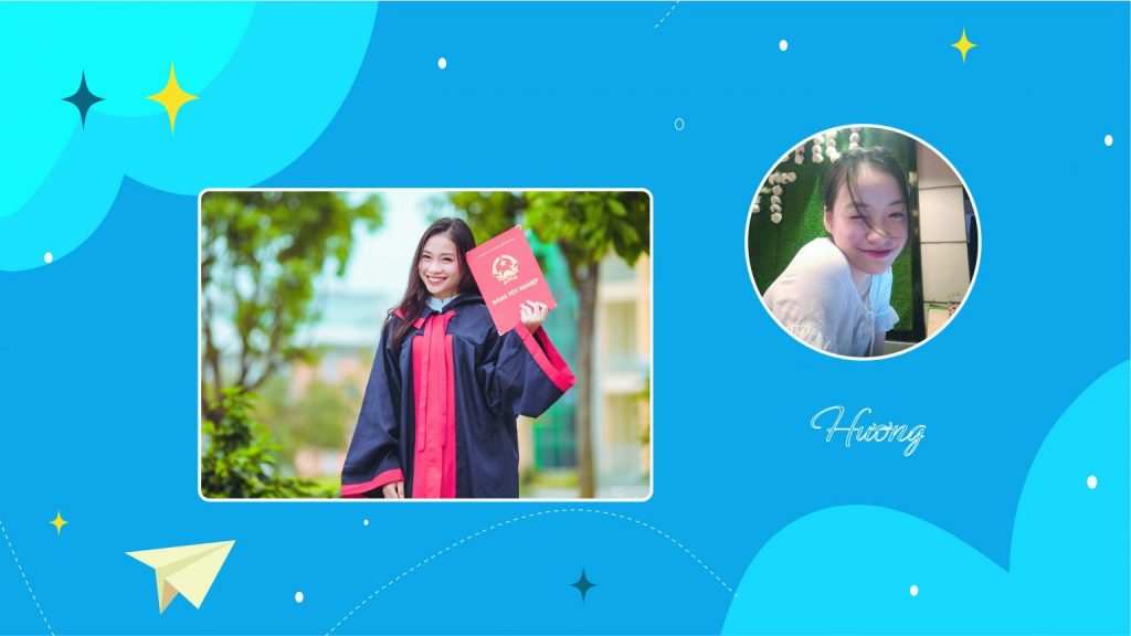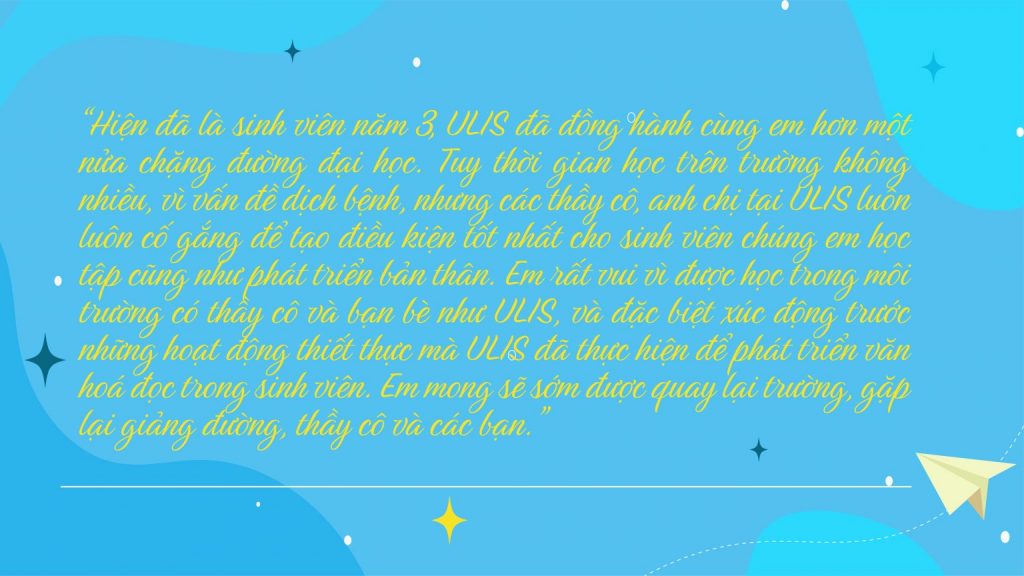 “Hiện đã là sinh viên năm 3, ULIS đã đồng hành cùng em hơn một nửa chặng đường đại học. Tuy thời gian học trên trường không nhiều, vì vấn đề dịch bệnh, nhưng các thầy cô, anh chị tại ULIS luôn luôn cố gắng để tạo điều kiện tốt nhất cho sinh viên chúng em học tập cũng như phát triển bản thân. Em rất vui vì được học trong môi trường có thầy cô và bạn bè như ULIS, và đặc biệt xúc động trước những hoạt động thiết thực mà ULIS đã thực hiện để phát triển văn hoá đọc trong sinh viên. Em mong sẽ sớm được quay lại trường, gặp lại giảng đường, thầy cô và các bạn”, Hương nhắn nhủ.