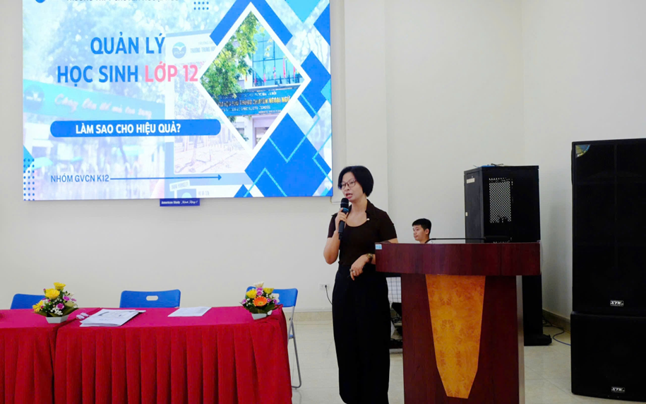Tiếp theo chương trình Hội nghị là các bản tham luận được chuẩn bị công phu, chu đáo đến từ tập thể giáo viên chủ nhiệm (GVCN) từng khối: GVCN khối 11 báo cáo tham luận Văn hóa ứng xử trong nhà trường của học sinh Chuyên Ngoại ngữ, GVCN khối 12 báo cáo tham luận Quản lí học sinh khối 12 làm sao cho hiệu quả? Từng tham luận là những kinh nghiệm vô cùng quý giá của thầy cô chủ nhiệm các khối chia sẻ và học hỏi lẫn nhau để công tác chủ nhiệm luôn được coi là một trong những “đặc sản” của trường THPT Chuyên Ngoại ngữ.
