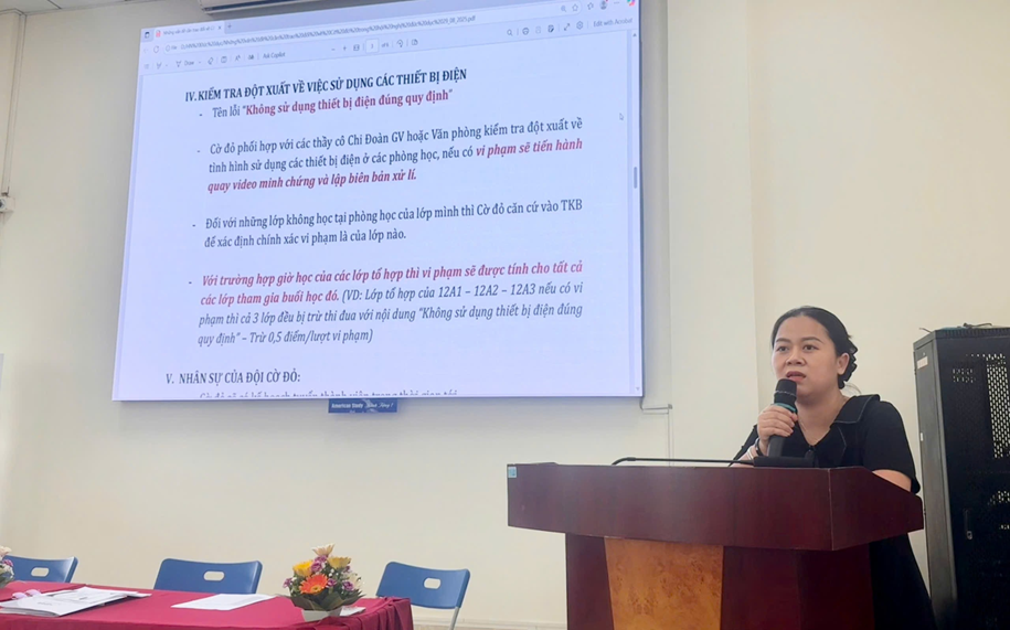 Hội nghị cũng đã thảo luận và thông qua Kế hoạch hoạt động đội cờ đỏ năm học 2025-2026, Tiêu chí xếp loại chi đoàn năm học 2025-2026 do cô Phạm Hoài Thu và cô Vũ Thanh Thảo đại diện trình bày. Các ý kiến tập trung vào việc đưa ra những giải pháp tích cực để tạo một môi trường giáo dục nhân văn nhưng đủ tính nghiêm khắc để hướng các học sinh tiến đến chân dung hoàn thiện nhất với đầy đủ năng lực và phẩm chất của một học sinh Chuyên Ngoại ngữ.