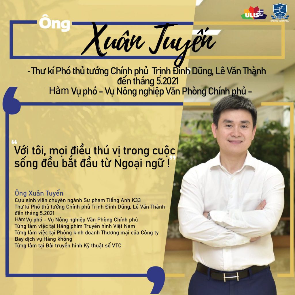 Anh Nguyễn Xuân Tuyến là cựu sinh viên K33 Khoa Anh. Từng là thư ký của Phó Thủ tướng Trịnh Đình Dũng và hiện anh đang đảm nhiệm cương vị Hàm Vụ phó Vụ Nông nghiệp Văn phòng Chính phủ. Hãy lắng nghe anh chia sẻ về chuyện nghề và những cơ hội có được từ ULIS nhé!