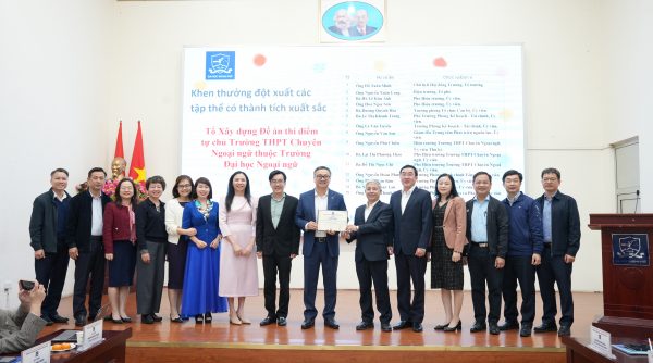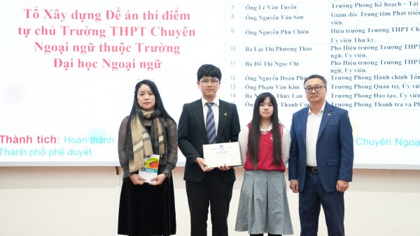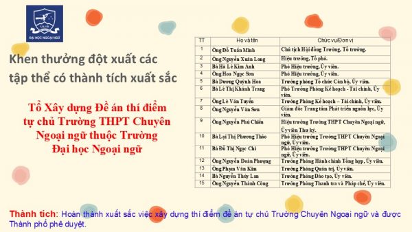 – Tổ Xây dựng Đề án thí điểm tự chủ Trường THPT Chuyên Ngoại ngữ thuộc Trường Đại học Ngoại ngữ vì hoàn thành xuất sắc việc xây dựng thí điểm đề án tự chủ Trường Chuyên Ngoại ngữ và được Thành phố phê duyệt.
