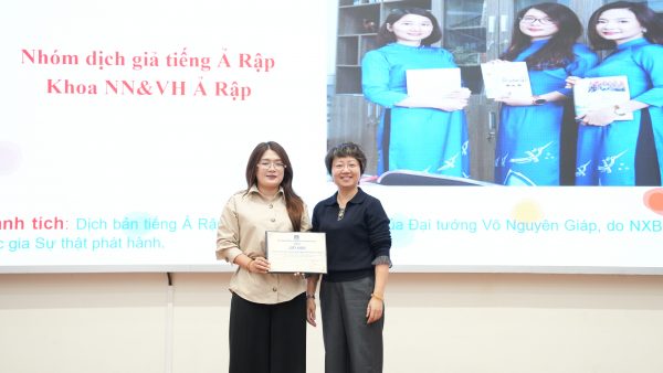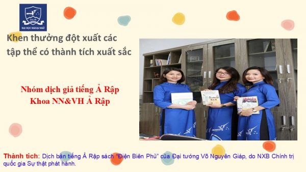 – Nhóm dịch giả tiếng Ả Rập Khoa NN&VH Ả Rập vì hoàn thành xuất sắc dịch bản tiếng Ả Rập sách “Điện Biên Phủ” của Đại tướng Võ Nguyên Giáp, do NXB Chính trị quốc gia Sự thật phát hành.
