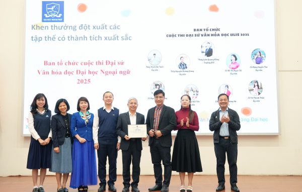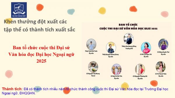 – Ban tổ chức Cuộc thi Đại sứ Văn hóa đọc Đại học Ngoại ngữ 2025 vì đã có thành tích nhiều năm tổ chức thành công cuộc thi Đại sứ Văn hóa đọc tại Trường Đại học Ngoại ngữ.