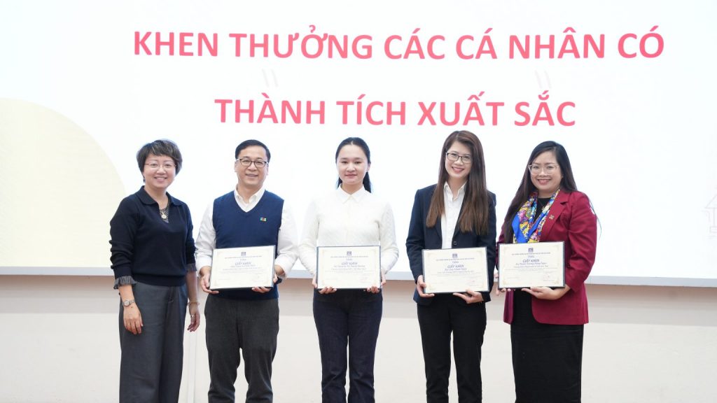 Về quyết định nhân sự, Nhà trường đã trao Quyết định công nhận đạt tiêu chuẩn chức danh Phó giáo sư và khen thưởng cho các cô: Vũ Thị Thanh Nhã (Khoa NN&VH Anh), Đỗ Thị Bích Thủy (Khoa NN&VH Pháp), Nguyễn Thị Minh Tâm (Khoa NN&VH Anh).