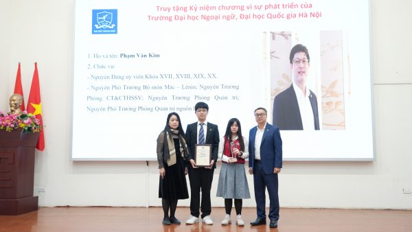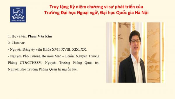 Trường Đại học Ngoại ngữ, Đại học Quốc gia Hà Nội cho thầy Phạm Văn Kim, Nguyên Đảng ủy viên Khóa XVII, XVIII, XIX, XX; Nguyên Phó Trưởng Bộ môn Mác – Lênin; Nguyên Trưởng Phòng CT&CTHSSV; Nguyên Trưởng Phòng Quản trị; Nguyên Phó Trưởng Phòng Quản trị nguồn lực.