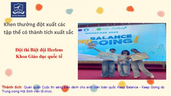 – Đội thi Biệt đội Herlens Khoa Giáo dục quốc tế vì giành giải Quán quân Cuộc thi sáng kiến dành cho sinh viên toàn quốc Keep Balance – Keep Going do Trung ương Hội Sinh viên tổ chức.