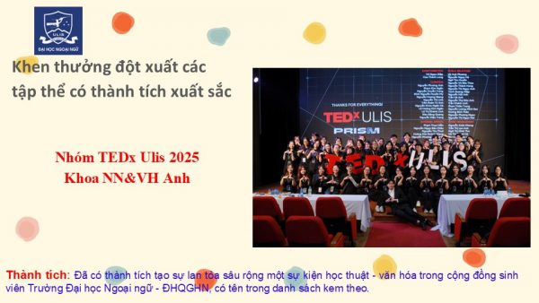 – Nhóm TEDx ULIS 2025 Khoa NN&VH Anh vì đã có thành tích tạo sự lan tỏa sâu rộng một sự kiện học thuật – văn hóa trong cộng đồng sinh viên Trường Đại học Ngoại ngữ.