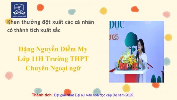 – Học sinh Đặng Nguyễn Diễm My (Lớp 11H Trường THPT Chuyên Ngoại ngữ) vì đạt giải Nhất Đại sứ Văn hóa đọc cấp Bộ năm 2025.