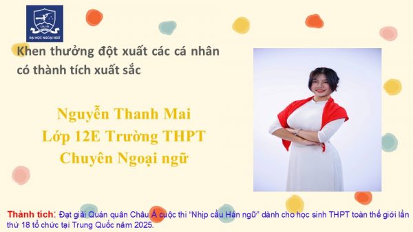 – Học sinh Nguyễn Thanh Mai (Lớp 12E Trường THPT Chuyên Ngoại ngữ) vì đạt giải Quán quân Châu Á cuộc thi “Nhịp cầu Hán ngữ” dành cho học sinh THPT toàn thế giới lần thứ 18 tổ chức tại Trung Quốc năm 2025.