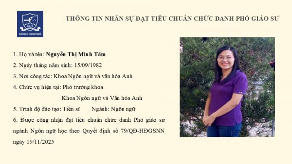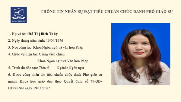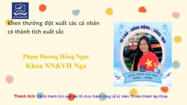 – Cô Phạm Dương Hồng Ngọc (Khoa NN&VH Nga) vì đã có thành tích xuất sắc tổ chức thành công Lễ kỷ niệm 70 năm thành lập Khoa.