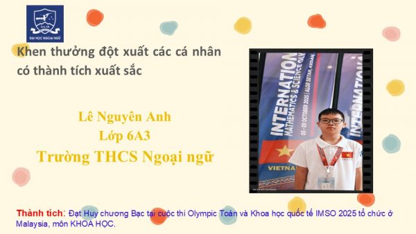 – Học sinh Lê Nguyên Anh (Lớp 6A3 Trường THCS Ngoại ngữ) vì đạt Huy chương Bạc tại cuộc thi Olympic Toán và Khoa học quốc tế IMSO 2025 tổ chức ở Malaysia, môn KHOA HỌC.
