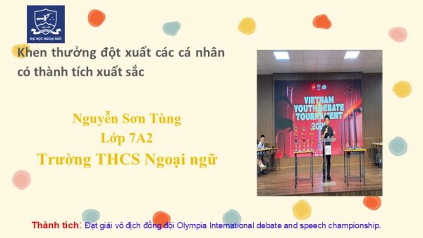 – Học sinh Nguyễn Sơn Tùng (Lớp 7A2 Trường THCS Ngoại ngữ) vì đạt giải vô địch đồng đội Olympia International debate and speech championship.
