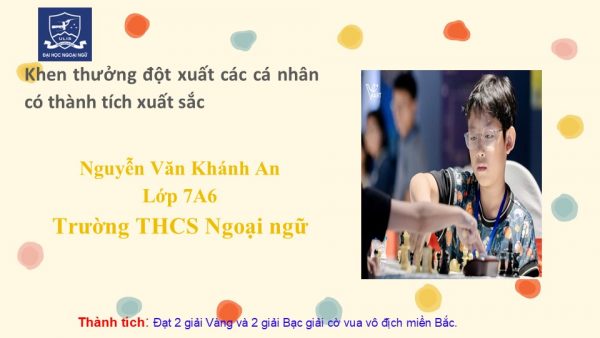 – Học sinh Nguyễn Văn Khánh An (Lớp 7A6 Trường THCS Ngoại ngữ) vì đạt 2 giải Vàng và 2 giải Bạc giải cờ vua vô địch miền Bắc.