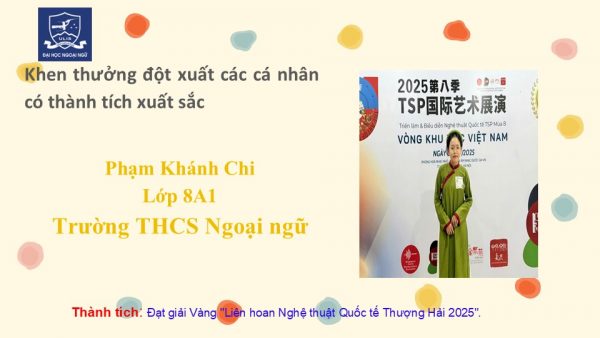 – Học sinh Phạm Khánh Chi (Lớp 8A1 Trường THCS Ngoại ngữ) vì đạt giải Vàng “Liên hoan Nghệ thuật Quốc tế Thượng Hải 2025”.