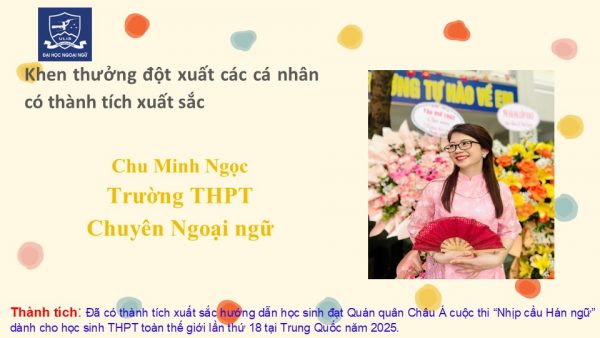 – Cô Chu Minh Ngọc (Trường THPT Chuyên Ngoại ngữ) vì đã có thành tích xuất sắc hướng dẫn học sinh đạt Quán quân Châu Á cuộc thi “Nhịp cầu Hán ngữ” dành cho học sinh THPT toàn thế giới lần thứ 18 tại Trung Quốc năm 2025.