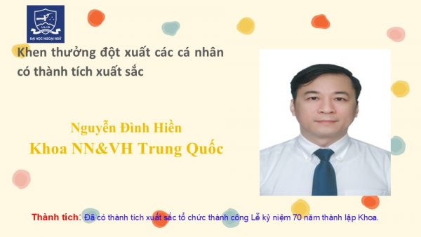 – Thầy Nguyễn Đình Hiền (Khoa NN&VH Trung Quốc) vì đã có thành tích xuất sắc tổ chức thành công Lễ kỷ niệm 70 năm thành lập Khoa.