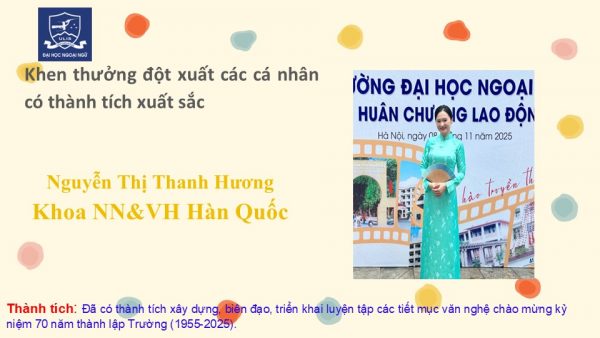 – Cô Nguyễn Thị Thanh Hương (Khoa NN&VH Hàn Quốc) vì đã có thành tích xây dựng, biên đạo, triển khai luyện tập các tiết mục văn nghệ chào mừng kỷ niệm 70 năm thành lập Trường (1955-2025).