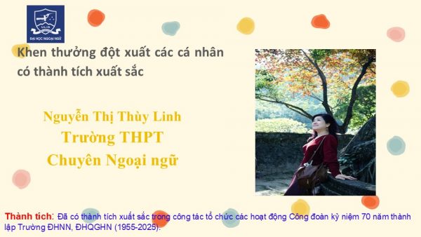 – Cô Nguyễn Thị Thùy Linh (Trường THPT Chuyên Ngoại ngữ) vì đã có thành tích xuất sắc trong công tác tổ chức các hoạt động Công đoàn kỷ niệm 70 năm thành lập Trường ĐHNN, ĐHQGHN (1955-2025).