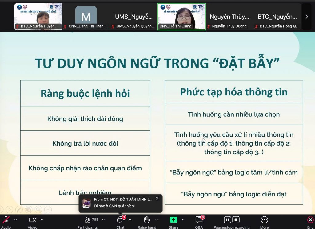 Chuyển đổi số không chỉ có ý nghĩa trong giảng dạy, học tập mà còn có tính ứng dụng trong hoạt động văn phòng trường phổ thông tại Trường THPT Chuyên Ngoại ngữ. Thầy Nguyễn Hồng Quang – chuyên viên Văn phòng Trường THPT Chuyên Ngoại ngữ đã có phần trình bày về tính ứng dụng của chuyển đổi số trong các thủ tục hành chính đối với học sinh, trong công tác văn phòng với quy trình làm việc đơn giản, ngắn gọn, nhanh chóng trên website. Khép lại tham luận của Hội nghị là phần chia sẻ với chủ đề thú vị: “Bẫy AI” đến từ Cô Hồ Thị Giang – Giáo viên Trường THPT CNN và em Nguyễn Thuỳ Dương – Học sinh lớp 11G, em Đặng Thị Thanh Mai – học sinh lớp 11E Trường THPT CNN. Theo cô Giang, tư duy ngôn ngữ có tính ứng dụng cụ thể trong việc sử dụng AI, nhưng “Thử thách AI” đã thu hút được sự hứng thú của học sinh khi chính học sinh là đối tượng tham gia trực tiếp vào dự án “Bẫy AI” bằng cả tiếng Việt và tiếng Anh. Chia sẻ trực tiếp của em Nguyễn Thuỳ Dương và em Đặng Thị Thanh Mai đã trở thành minh chứng cho việc AI không hoàn toàn đúng trong mọi trường hợp mà người học, người ứng dụng AI trong quá trình học tập cần phải tỉnh táo, phân biệt được tính đúng/sai để sử dụng trí tuệ nhân tạo một cách thông minh hơn, hiệu quả hơn.