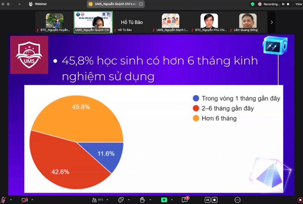Bức tranh về thực tế ứng dụng AI trong giảng dạy tại Trường THCS Ngoại ngữ được thể hiện qua tham luận của thầy Nguyễn Mạnh Linh – Giáo viên Tiếng Anh Trường THCS Ngoại ngữ và thầy Nguyễn Hoàng Giang- Phó Hiệu trưởng Trường THCS Ngoại ngữ cùng em Nguyễn Quỳnh Chi – Học sinh lớp 8A3. Những nền tảng ứng dụng/ app hữu ích được sử dụng trong quá trình giảng dạy, kiểm tra, đánh giá như ELSA hay I CORRECT hay những khảo sát chi tiết về chủ đề: AI với Umser: Khảo sát về việc sử dụng AI trong học sinh Trường THCS Ngoại ngữ với những con số thực tế đã minh chứng cho quá trình, tần suất sử dụng AI trong học tập đang trở nên phổ biến trong học sinh.