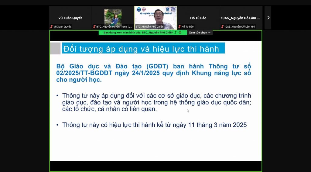 Tiếp nối lời chia sẻ của thầy Bảo, phần trình bày của Thầy Nguyễn Phú Chiến – Hiệu trưởng trường THPT Chuyên ngoại ngữ đã mang đến những thông tin hữu ích với chủ đề: Khung năng lực số của người học với những khía cạnh: Năng lực số là gì? Mục đích sử dụng năng lực số, Cấu trúc và những miền năng lực số, đối tượng áp dụng và hiệu lực thi hành của Khung năng lực số, …