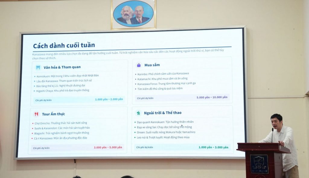 Chia sẻ tại hội thảo, GS. Tabata Hidetoshi nhấn mạnh rằng Kanazawa và khu vực Hokuriku là một lựa chọn nghề nghiệp đầy tiềm năng cho sinh viên học Tiếng Nhật, với môi trường sống tốt và nhiều cơ hội việc làm không kém các thành phố lớn như Tokyo hay Osaka. GS. Tabata Hidetoshi khuyến khích sinh viên bắt đầu chuẩn bị nghiêm túc cho quá trình tìm việc tại các doanh nghiệp, đồng thời giới thiệu chuỗi 6 buổi hội thảo hỗ trợ toàn diện, giúp sinh viên trang bị từ kỹ năng phỏng vấn, viết CV, hiểu văn hóa doanh nghiệp cho đến tiếp xúc trực tiếp với nhà tuyển dụng, nhằm mở ra cơ hội việc làm thực tế và phù hợp.