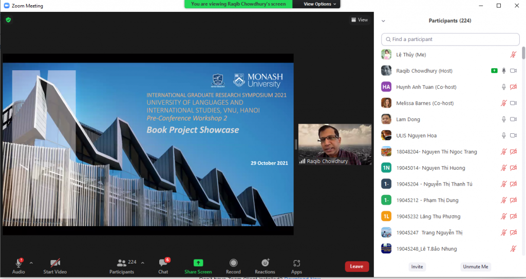 Tiền hội thảo IGRS, Nhà trường kết hợp với Trường Đại học Monash tổ chức 2 buổi tọa đàm chuyên đề học thuật trực tuyến dành cho học viên và nghiên cứu sinh với 2 chủ đề: Xây dựng cầu nối về hợp tác giữa 2 trường đại học ULIS và Monash, Dự án xuất bản sách. Đây là cơ hội cho các học viên cao học và nghiên cứu sinh nâng cao sự hiểu biết, kỹ năng của mình thông qua phần trình bày, trao đổi, chia sẻ kinh nghiệm với các học giả quốc tế.