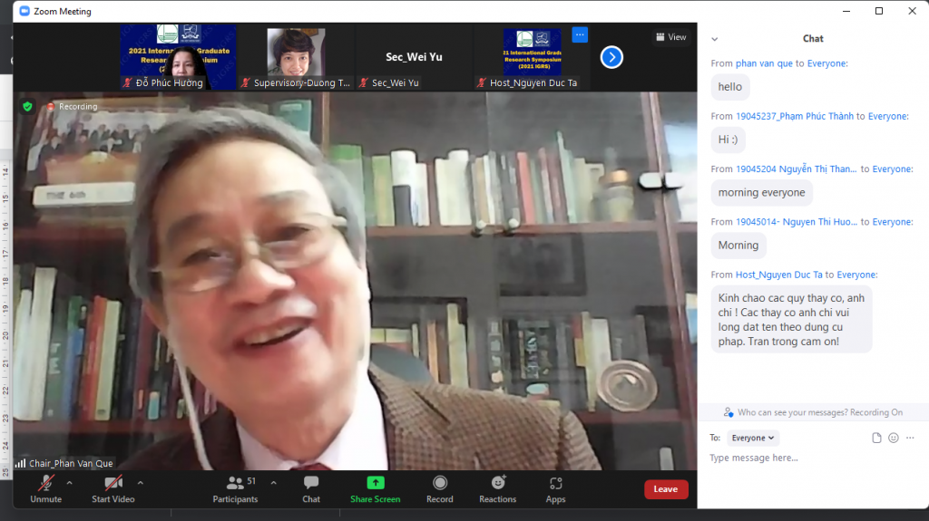Hội thảo khoa học quốc tế dành cho học viên cao học và nghiên cứu sinh năm 2021 (2021 IGRS) đã thành công tốt đẹp sau một ngày làm việc sôi nổi với 110 báo cáo và 1 tọa đàm trao đổi tại 12 tiểu ban song song thu hút hơn 430 đại biểu tham dự.