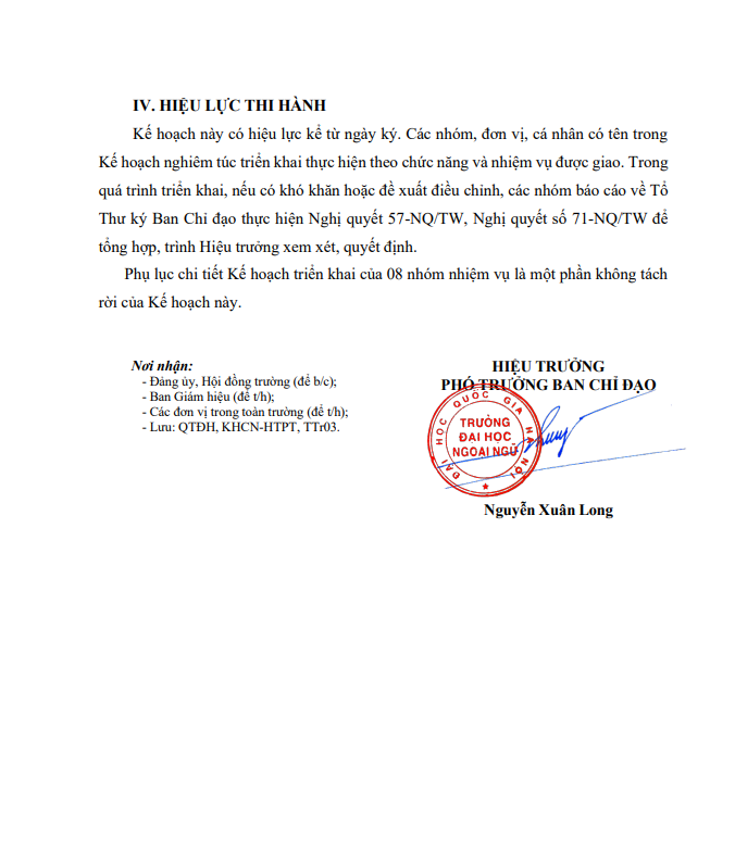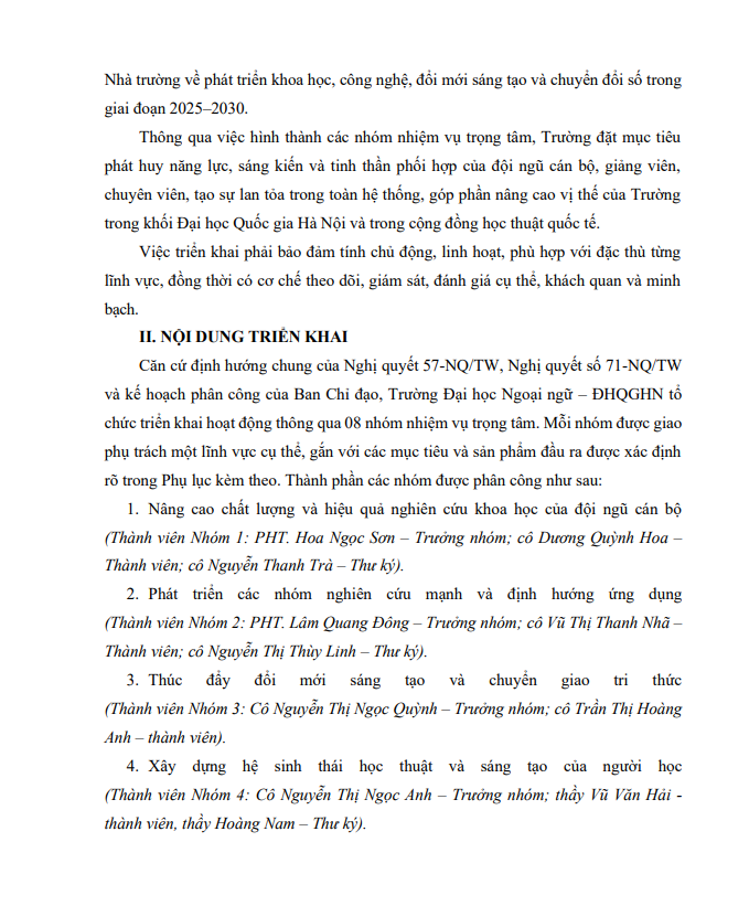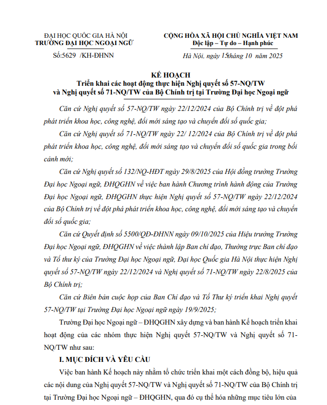 Kế Hoạch Triển khai các hoạt động thực hiện Nghị quyết số 57-NQ/TW và Nghị quyết số 71-NQ/TW của Bộ Chính trị tại Trường Đại học Ngoại ngữ