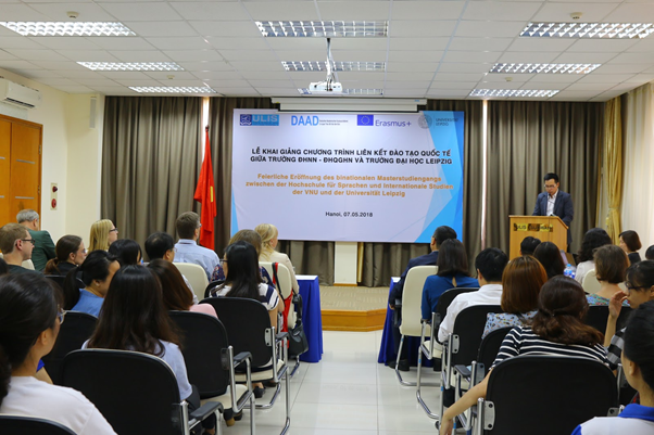 Ngày 7/5/2018 tại hội trường ULIS-Sunwah đã diễn ra Lễ khai giảng Khóa I (QH2017D2) chương trình liên kết đào tạo quốc tế trình độ Thạc sĩ chuyên ngành “Ngôn ngữ Đức“ và “Tiếng Đức là ngoại ngữ và ngôn ngữ thứ hai trong bối cảnh Việt Nam – Đức“ do Trường Đại học Ngoại ngữ – ĐHQGHN và Trường Đại học Leipzig (CHLB Đức) cùng cấp bằng và do Liên minh Châu Âu (Chương trình Erasmus+) và Cơ quan Trao đổi Hàn lâm Đức (DAAD) tài trợ.