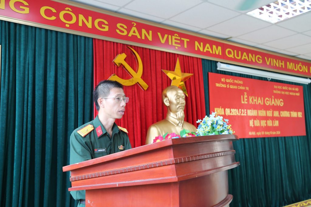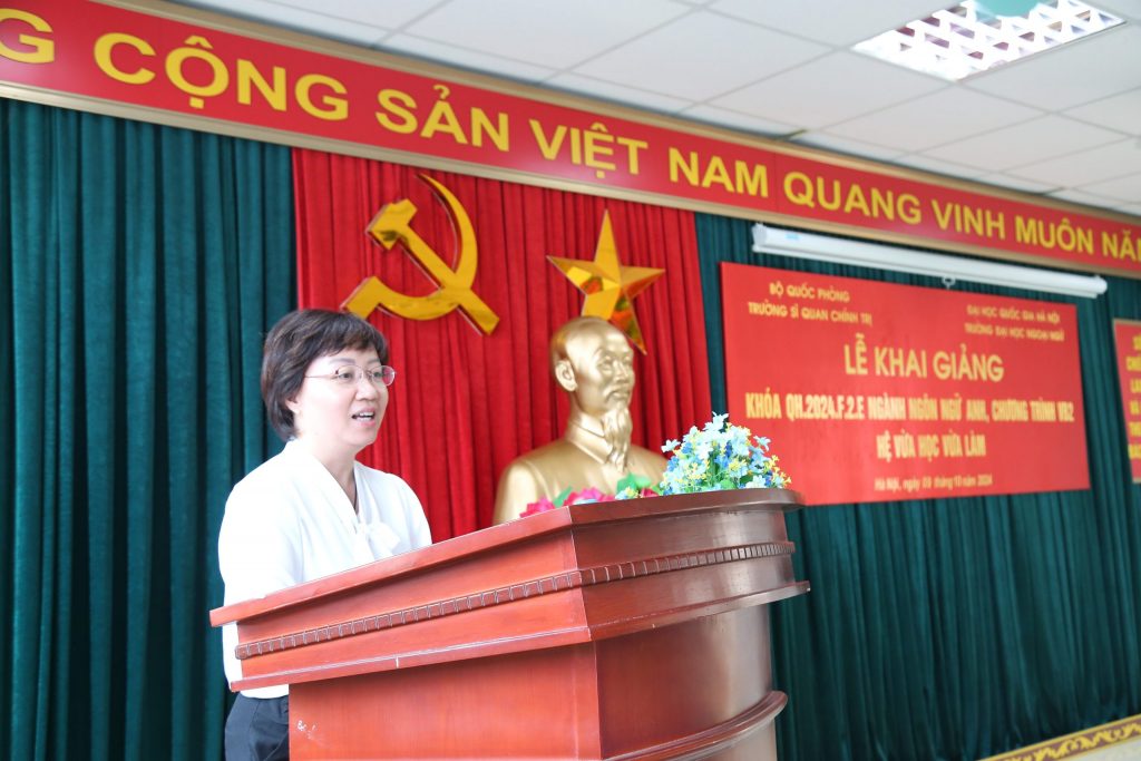 Tại Lễ Khai giảng, PGS. TS. Hà Lê Kim Anh, Phó Hiệu trưởng Trường Đại học Ngoại ngữ gửi lời cảm ơn đến Đảng ủy, Ban Giám hiệu Trường Đại học Chính trị đã luôn tin tưởng, phối hợp mở lớp đào tạo Văn bằng 2 ngành Ngôn ngữ Anh; đồng thời, gửi lời chúc mừng đến 32 học viên trúng tuyển năm 2024. Đồng chí PGS. TS. Hà Lê Kim Anh cũng khẳng định trong xã hội hiện đại, Tiếng Anh là công cụ hữu hiệu trong việc khai thác thông tin, đổi mới phương pháp giảng dạy, tiếp thu thành tựu khoa học, kỹ thuật của thế giới. Những năm qua, Trường Đại học Ngoại ngữ – Đại học Quốc gia Hà Nội luôn quan tâm đến việc duy trì, nâng cao chất lượng phối hợp, hợp tác toàn diện với Trường Đại học Chính trị trong đào tạo, bồi dưỡng ngoại ngữ; cam kết tạo điều kiện tốt nhất cho người học.