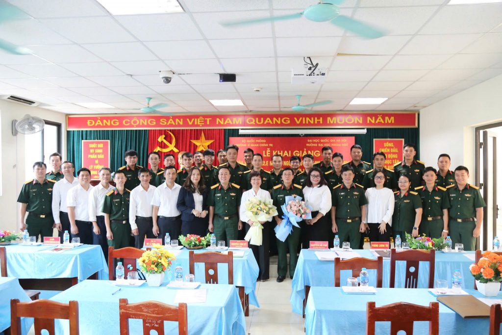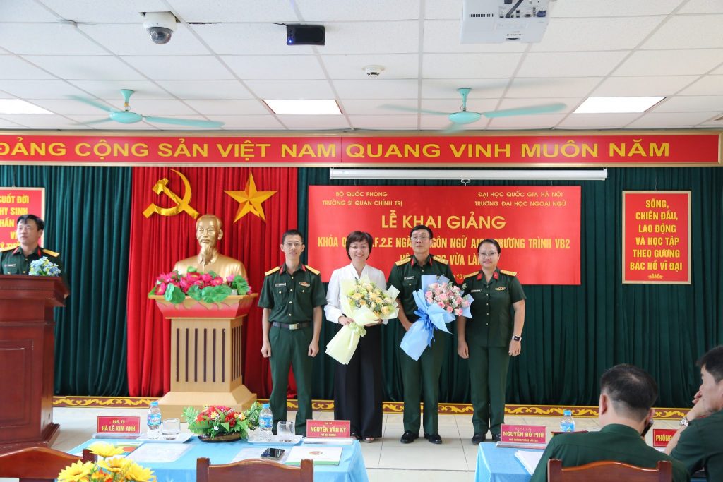 Dự lễ Khai giảng có đồng chí Đại tá, TS. Nguyễn Văn Kỷ, Phó Hiệu trưởng Trường Đại học Chính trị; đồng chí PGS, TS Hà Lê Kim Anh, Phó Hiệu trưởng Trường Đại học Ngoại ngữ – Đại học Quốc gia Hà Nội. Tham dự Lễ Khai giảng còn có đại biểu cán bộ, giảng viên của hai Nhà trường và 32 học viên trúng tuyển lớp đào tạo Văn bằng 2 ngành ngôn ngữ Anh hệ vừa làm vừa học năm 2024.
