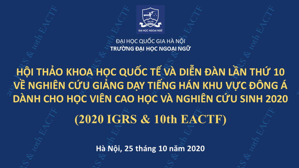 Ngày 25/10/2020, Trường Đại học Ngoại ngữ – Đại học Quốc gia Hà Nội sẽ tổ chức Hội thảo khoa học quốc tế năm 2020 và Diễn đàn lần thứ X về Nghiên cứu giảng dạy tiếng Hán khu vực Đông Á dành cho HVCH & NCS. Sự kiện diễn ra với hình thức trực tuyến và có sự góp mặt của nhiều học giả quốc tế.