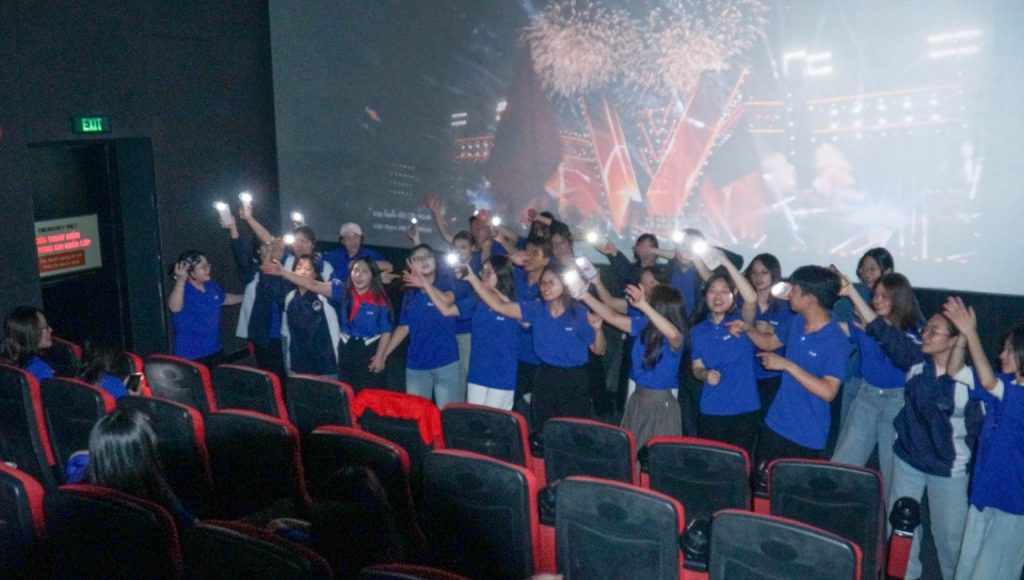 Trong không khí sôi động của buổi chiếu, những giai điệu nhạc phim vang lên khiến cả rạp như hòa làm một. Các bạn sinh viên cùng nhau ngân nga theo từng ca khúc quen thuộc, vỗ tay hòa nhịp với âm nhạc, có nhiều sinh viên còn cùng nhau nhảy theo điệu nhạc, phất cao lá cờ Tổ Quốc tạo nên một bầu không khí vừa sôi nổi, vừa thiêng liêng. Khoảnh khắc cả khán phòng cùng cất giọng hát về niềm tự hào dân tộc và tình yêu đất nước đã gắn kết mọi người lại gần nhau hơn, cùng lan tỏa tinh thần đoàn kết, niềm tin và khát vọng cống hiến cho Tổ quốc.